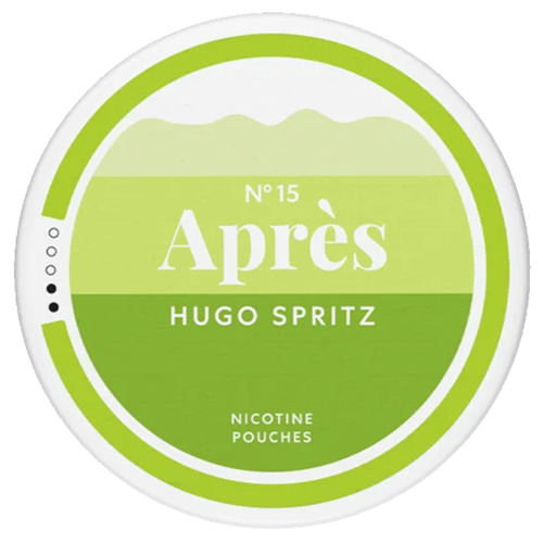 Après No.15 Hugo Spritz är ett vitt snus med nikotin från Après Nicotine AB, helt utan tobak. Produkten levereras i slim-format med smala portioner som är utformade för att ge en diskret passform under läppen.