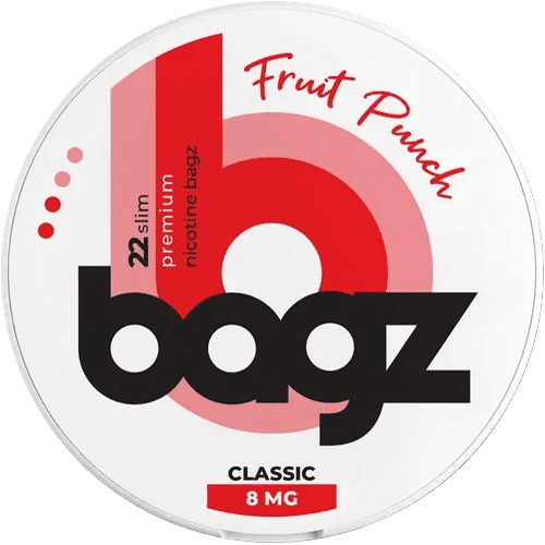BAGZ Fruit Punch är vitt snus med en smak av blandade frukter som ger en frisk och fruktig upplevelse. Förpackningen väger 14 gram och innehåller 22 portioner, där varje portion väger 0,625 gram. Nikotinstyrkan kan vara 8 mg eller 5 mg per portion beroende på variant.