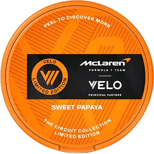 VELO McLaren Sweet Papaya Limited Edition tillhör kategorin all white och ingår i VELO:s sortiment av tobaksfria nikotinpåsar som produceras i Sverige.
